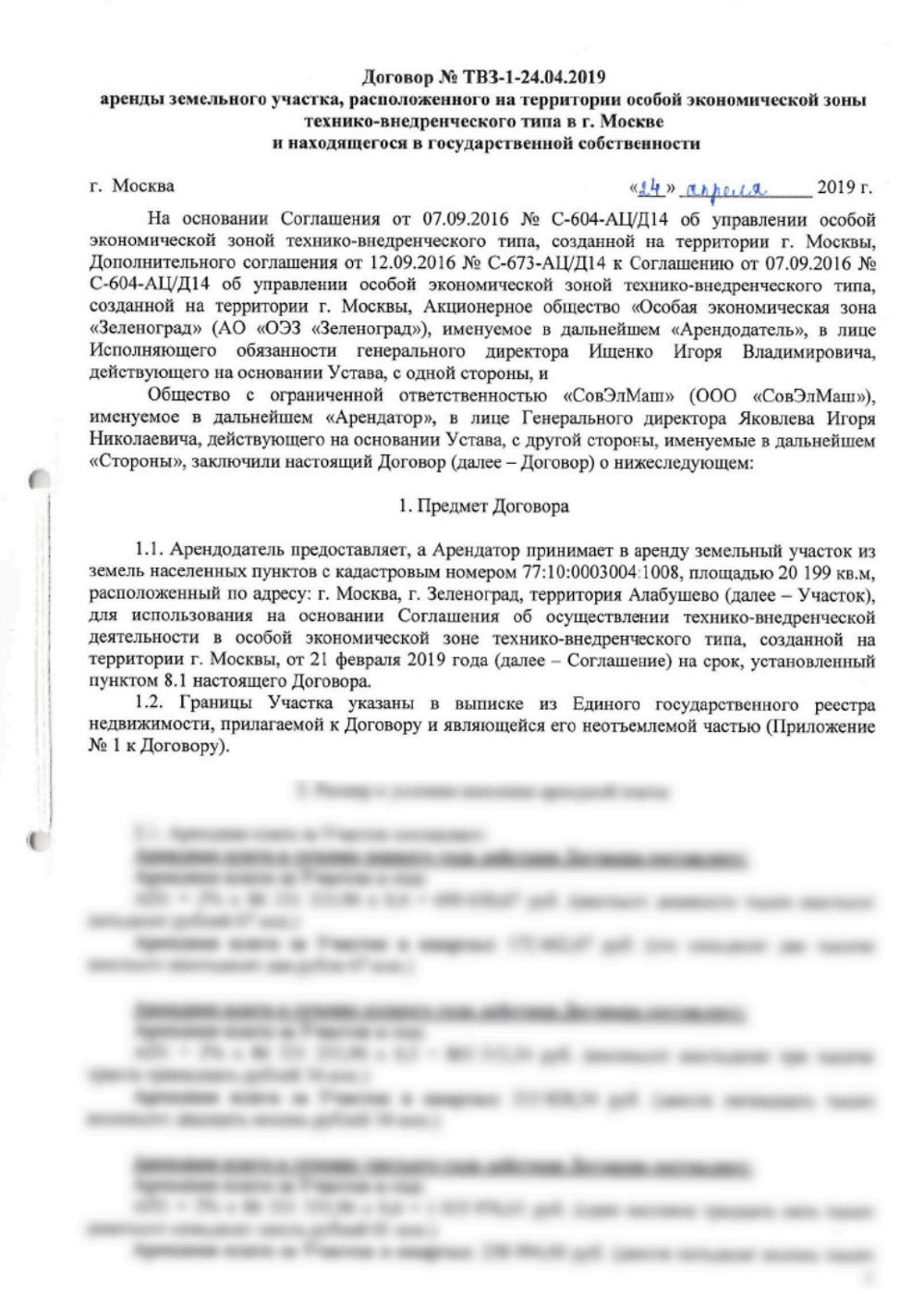 Договор аренды земельного участка на территории ОЭЗ «Технополис «Москва»