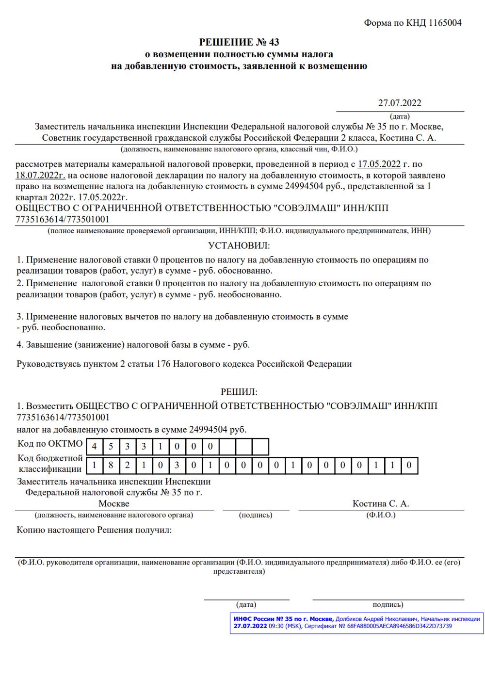 Решение о возмещении полностью суммы налога на добавленную стоимость от 27.07.2022