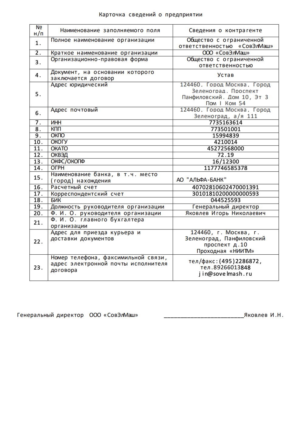 Карточка сведений о предприятии