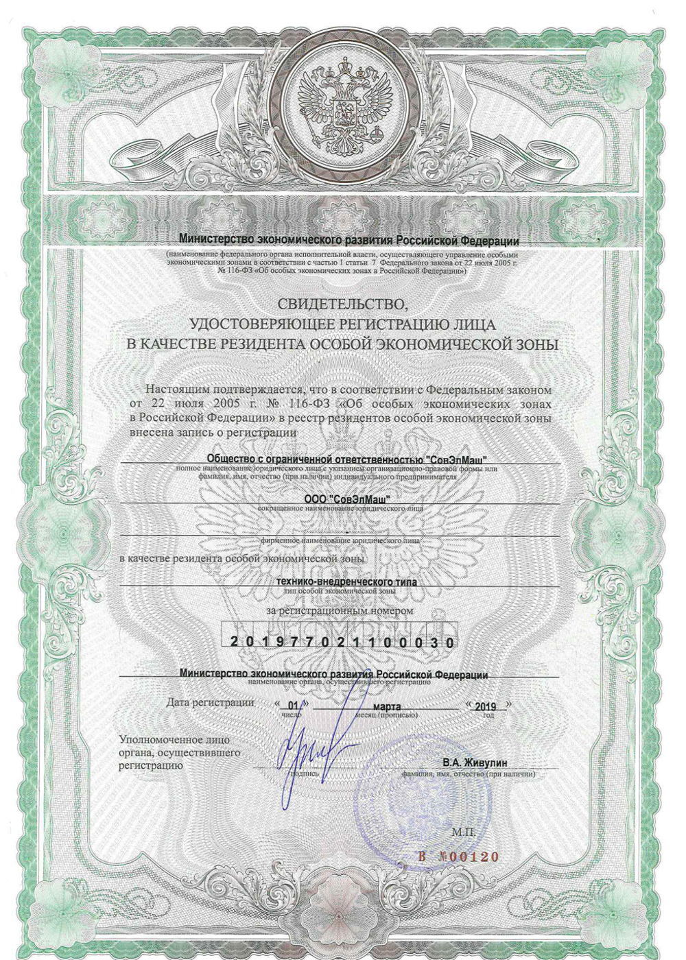 Свидетельство резидента ОЭЗ «Технополис «Москва»